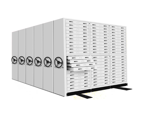 底圖架不同于檔案密集架,采用的是抽屜式結構,每列擁有百余個抽屜。特殊的結構也決定了它的作用只能用來存放設計圖、書畫、數據表等文件。因容量大、利用空間、使用方便。