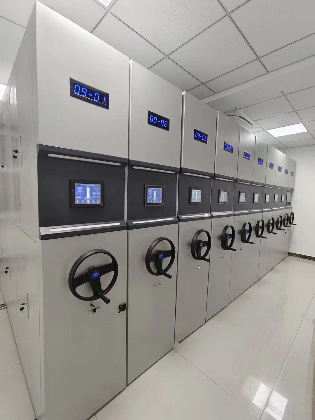 電腦多功能密集架具有操作到位時照明燈自動開啟、關閉的功能,方便用戶現場查閱資料。